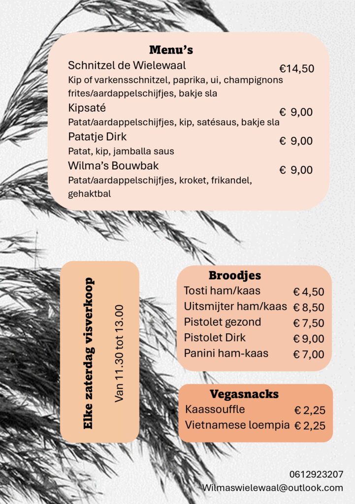 Bij Wilma’s Wielewaal kunt u op zaterdagmiddag genieten van verse vis en op vrijdagmiddag een gezellige vrijdagmiddag borrel komen drinken.